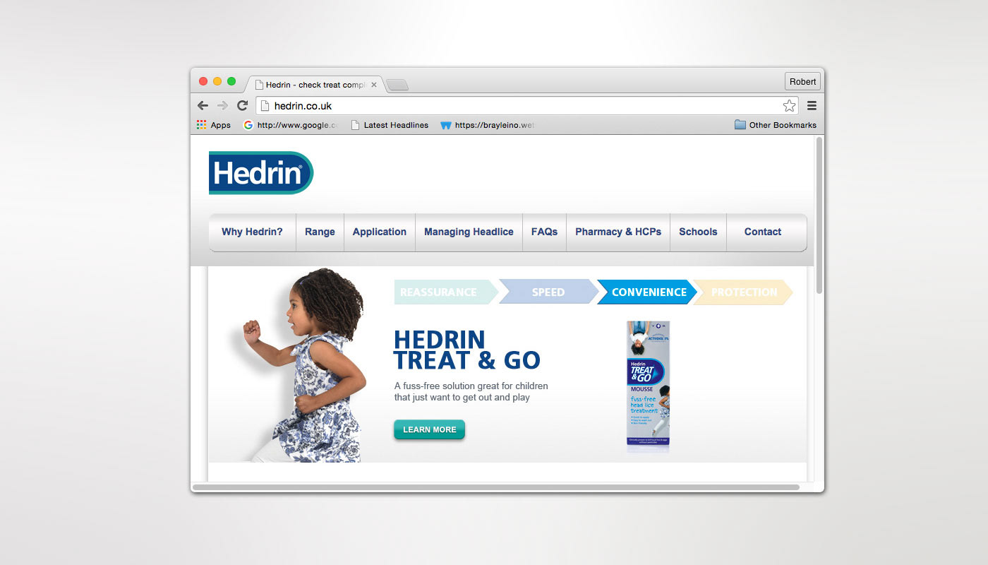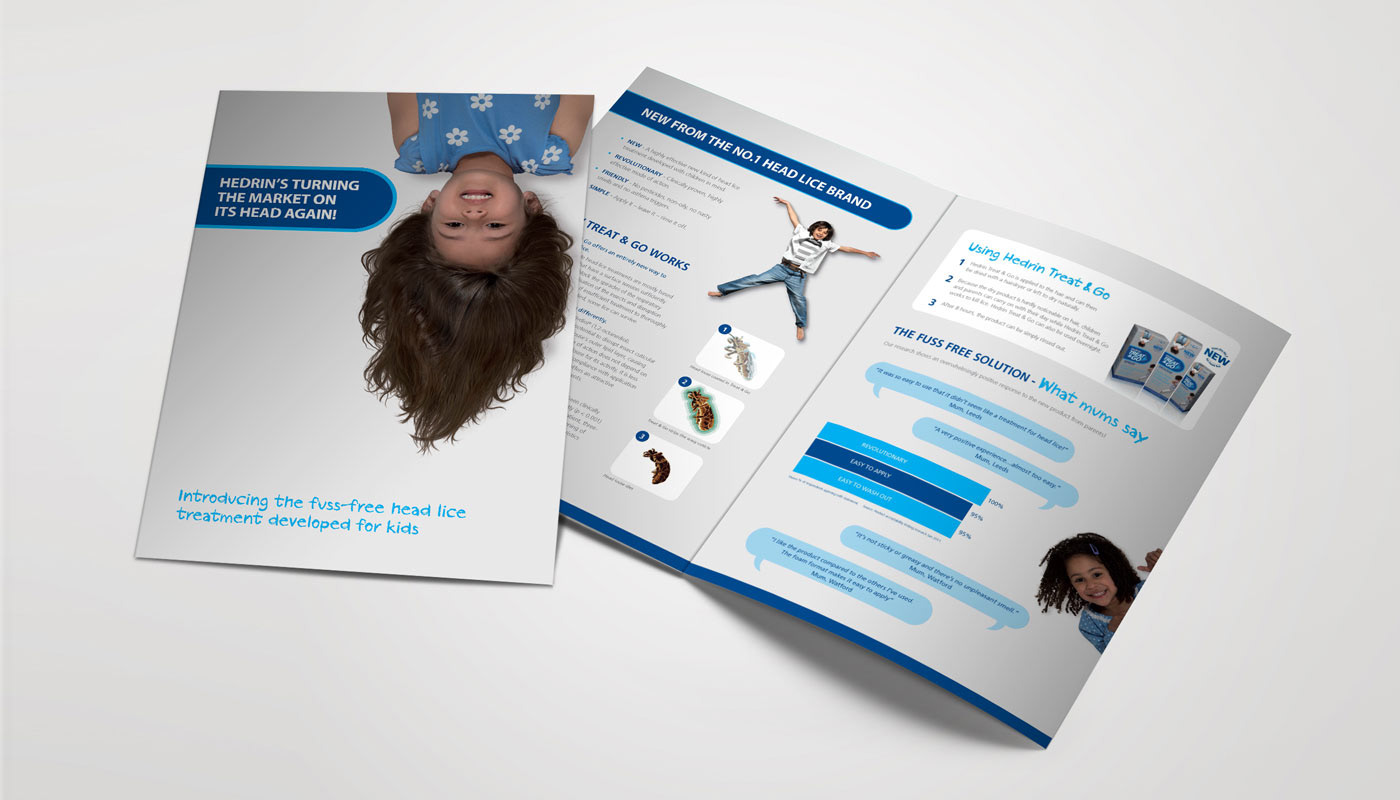 Hedrin is the UK’s no.1 selling brand of head-lice treatments. It’s owners, Thornton & Ross, were keen to grow the brand by launching a new product. The new product, ‘Treat and Go’ is unique because the solution is hardly noticeable on hair. This means it can be quickly applied and then left to work, allowing children to play. My brief was to retain synergy with the parent brand while clearly delivering the unique message about letting children play.