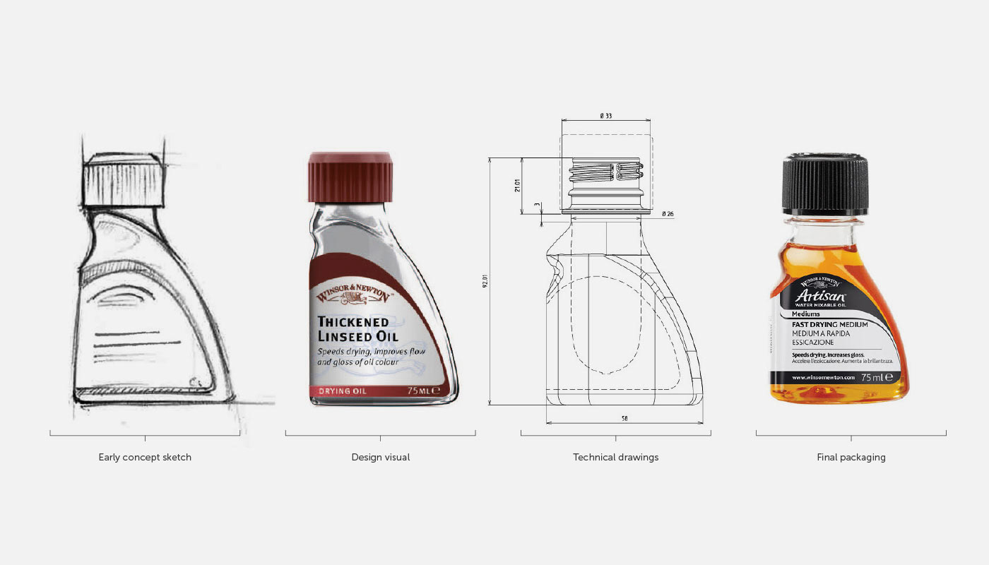 The world’s leading brand of fine art materials, Windsor & Newton, was starting to look dated. The packaging for their extensive range of solvents, oils and varnishes had been on shelf for many years and was being mimicked by competitors. My challenge was to design new packaging that would provided a distinctive shelf presence for the brand and re-connect with artists around the world. I developed a new ergonomic shape to enabled mess free pouring and a labelling structure to help artists navigate the range. Together they have resulted in a modern distinctive look for the range which dominates art shop shelves. This packaging was designed while working for Bray Leino. Winsor & Newton are not a client of Archer Studio.
